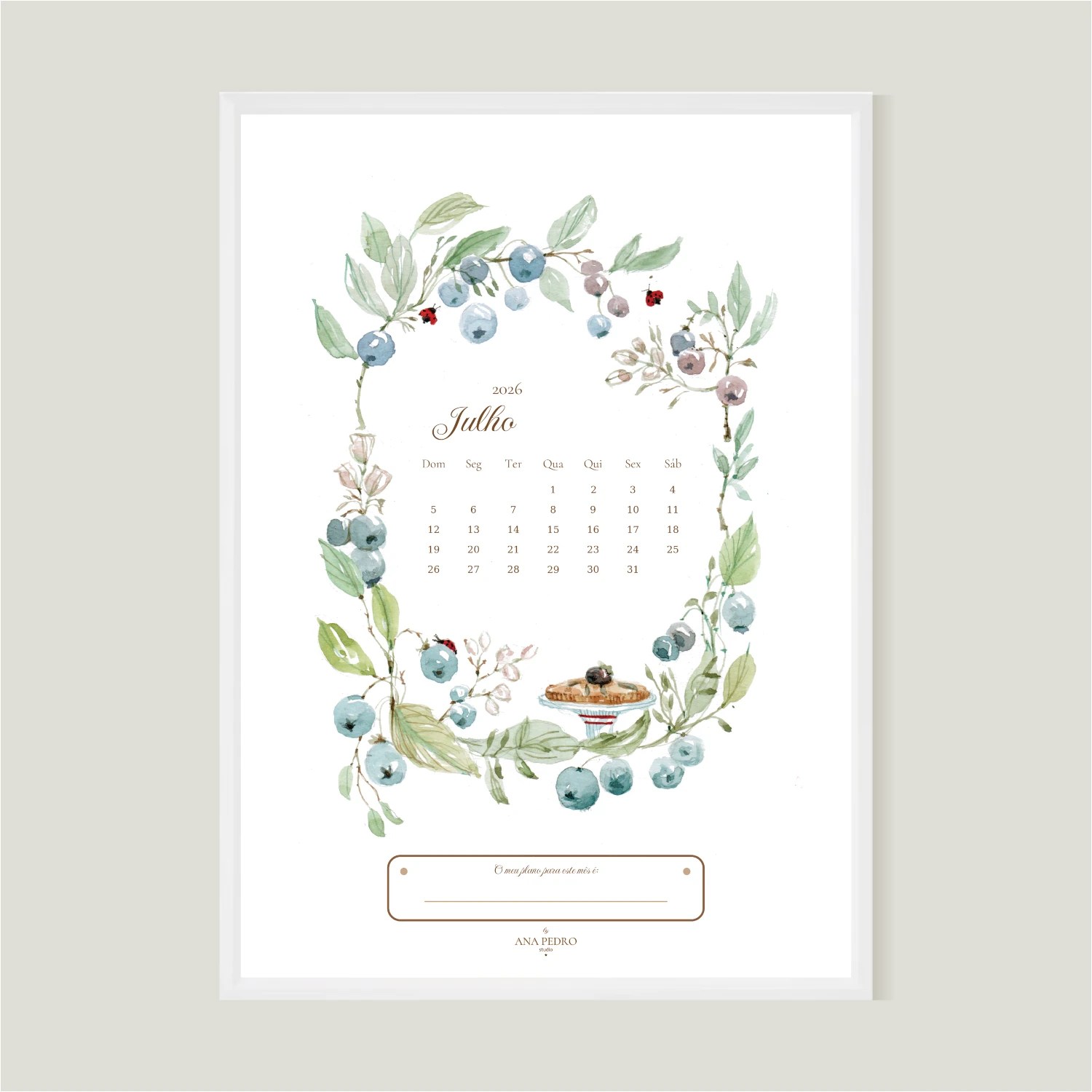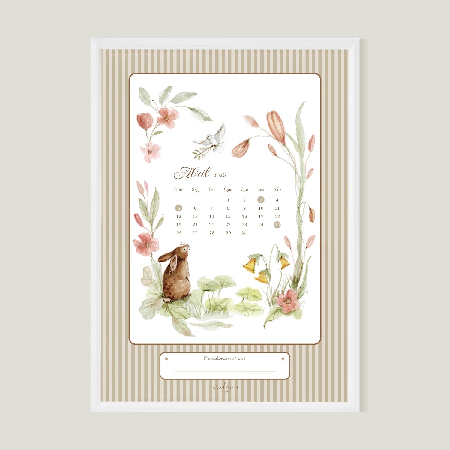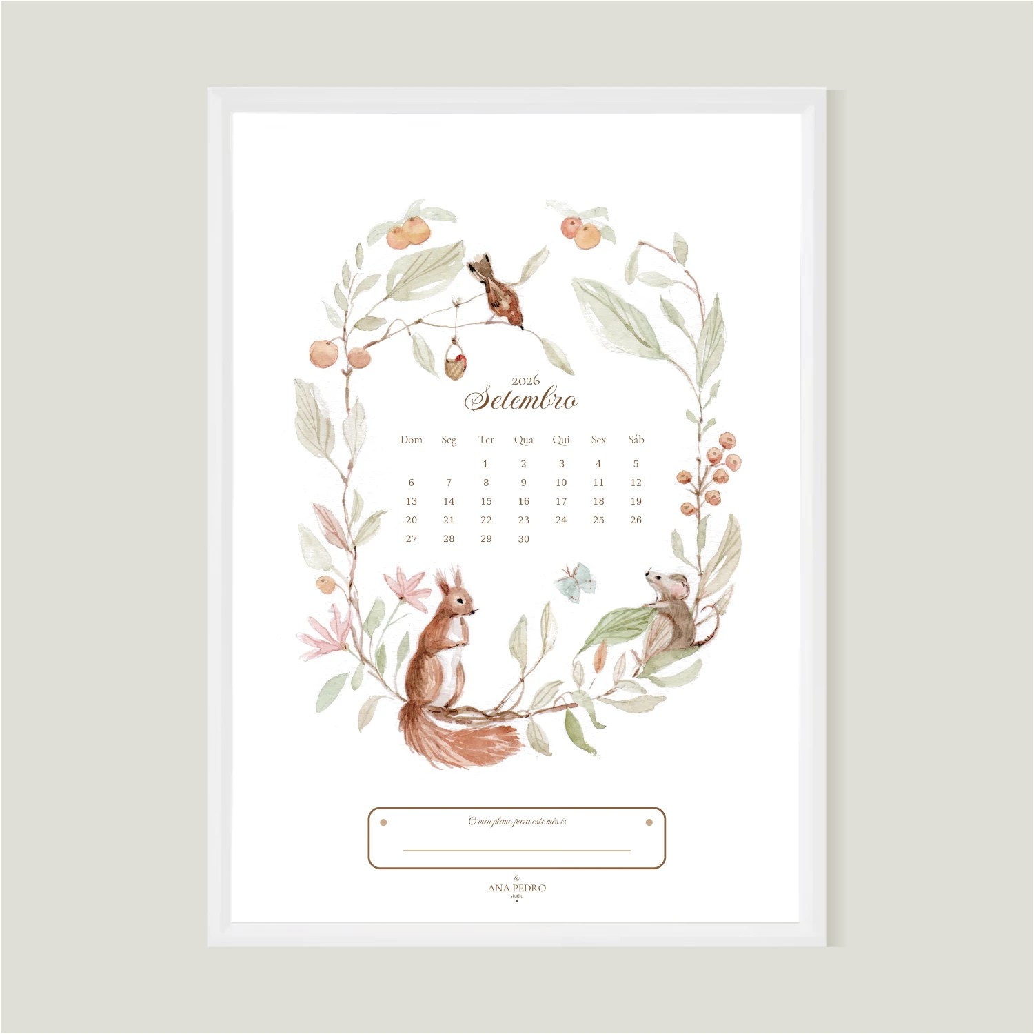 Um doce CALENDÁRIO, composto por 12 mimosas ilustrações que nos fazem sonhar! Este calendário é acompanhado por uma moldura branca simples, a qual poderá ser colocada numa parede ou sobre uma mesa. Poderão trocar facilmente as ilustrações consoante os meses.
